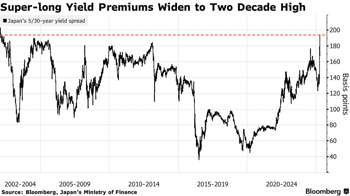 智通财经APP获悉,投资者要求持有日本30年期国债较5年期国债的溢价已扩大至逾20年来最高水平,原因是全球市场波动加剧和对日本财政状况的担忧推高了超长期日本国债收益率。根据计算,周一,两者之间的复合利差约为193个基点,为2002年5月以来最高。