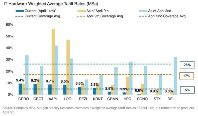 大摩表示,尽管这对该行所覆盖的美国IT硬件公司都有益处,但由于苹果(AAPL.US)和罗技(LOGI.US)的制造业务较多集中在中国、且其多项产品现被豁免于“对等关税”之外,因此受益最为显著。