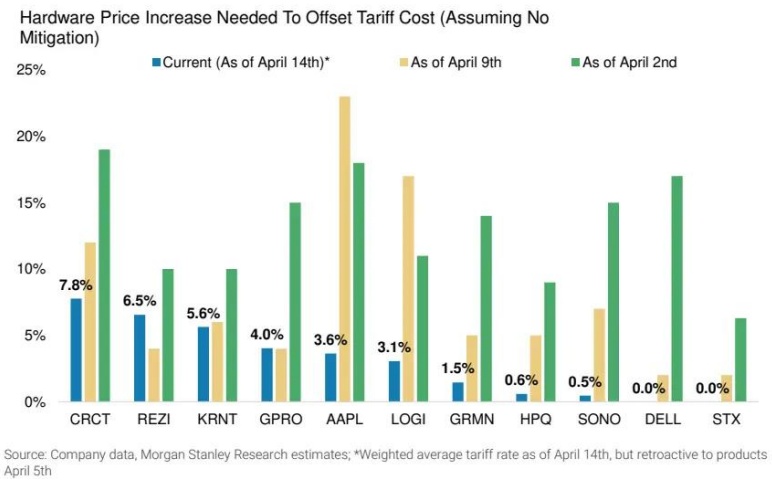 大摩指出,美国联邦政府4月11日公布的电子产品“对等关税”豁免显著减轻了该行所覆盖的美国IT硬件公司的关税成本负担,从最初估计的年化关税成本超过500亿美元(相当于该行业息税前利润的30%)大幅降低至当前的70亿美元(相当于该行业息税前利润的4%,但只是暂时的)。这是因为,几乎所有主要IT硬件类别——智能手机、个人电脑、平板电脑、存储阵列——目前均已被排除在“对等关税”范围之外,使得该行所覆盖美国IT硬件公司的平均关税税率从上周四的17%和4月2日的26%下降至目前的仅5%,同时令这些公司显著涨价以向终端客户转嫁关税成本的风险大大降低。