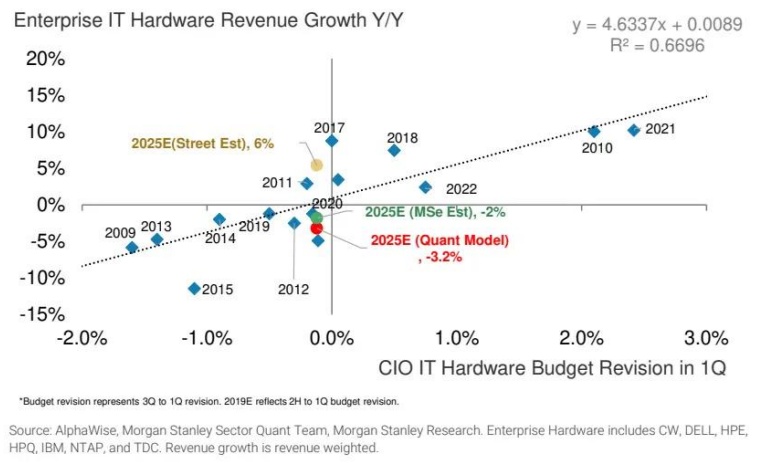 2)即使在4月2日特朗普宣布“对等关税”之前,该行2025年第一季度的CIO调查就已显示出对硬件支出的谨慎态度,并暗示2025年IT硬件营收将同比下降3%,而市场共识为增长6%(该行的预测为同比下降2%;)。不确定性高企和持续存在的未知因素可能继续成为支出计划的阻力因素,尽管该行仍相信,出于规避未来关税风险的考虑,部分关键项目的需求可能会在第二季度被提前释放。