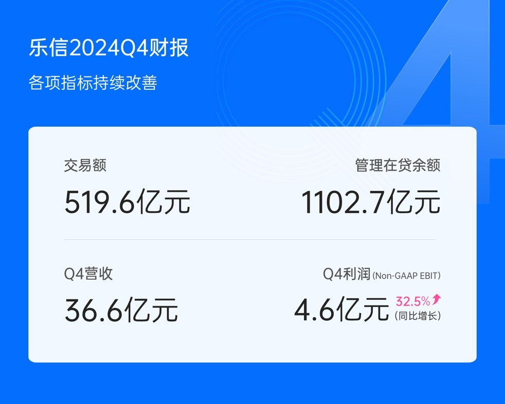 生态业务多点开花,反映到经营数据上,自然便是乐信朝着高质量发展的方向更进一步。根据公司此前披露的财报,2024年四季度乐信交易额为519.6亿元,管理在贷余额1102.7亿元。同期,公司营收36.6亿元,利润同比增加32.5%至4.6亿元。值得一提的是,乐信的利润指标已连续三个季度环比大增。