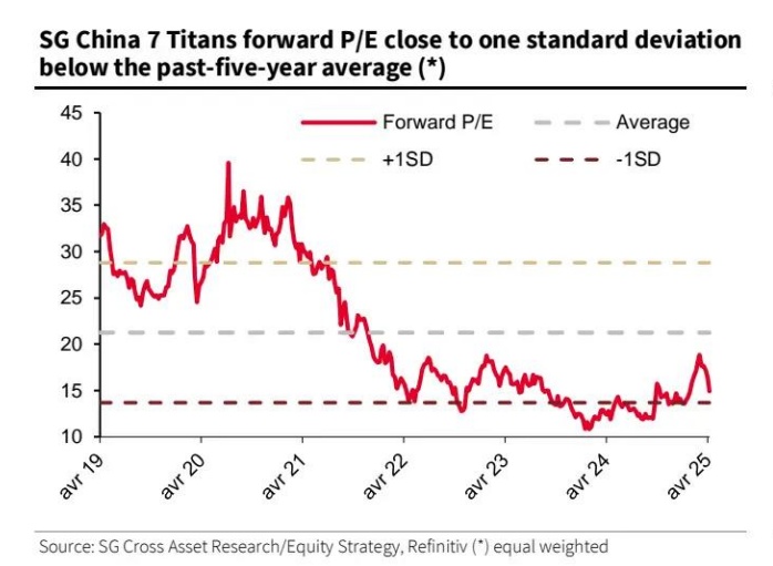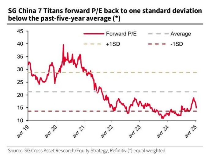 智通财经APP获悉,法国兴业银行的亚洲股票策略主管弗兰克・本齐姆拉(Frank Benzimra)4月14日发布报告称,自3月触及峰值以来,法兴中国“七巨头”(SGCHTTAN)已下跌 16%。基于估值、风险敞口和持仓考虑,建议逢低买入。列出的三大理由包括:估值偏低;主要面向国内市场,偏向消费领域;能吸引南向资金流入。