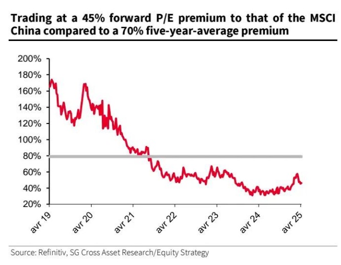 图表 7:法兴中国“七巨头”远期市盈率较明晟中国指数溢价 45%,而五年平均溢价率为 70%