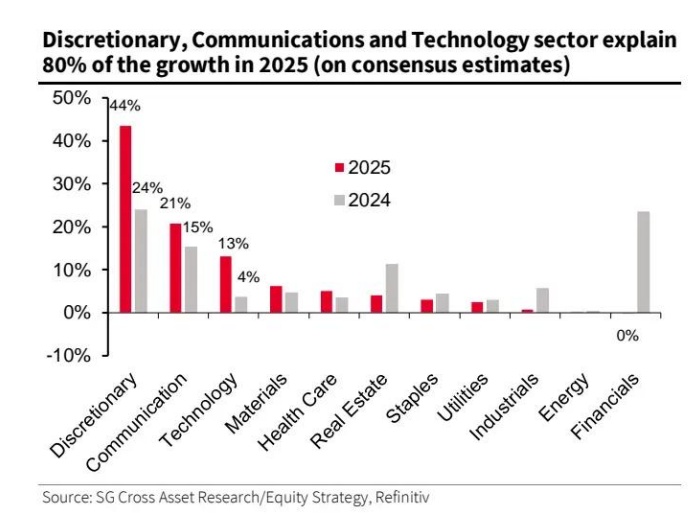 图表 9:非必需消费品、通信和科技行业预计在 2025 年贡献 80% 的增长(基于市场共识预期)