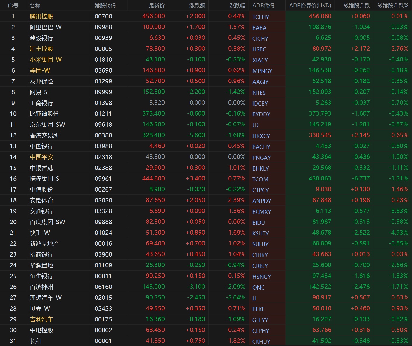 大型蓝筹股涨跌不一,汇丰控股收报80.972港元,较香港收市涨2.76%;腾讯控股收报456.06港元,较香港收市上涨0.01%。