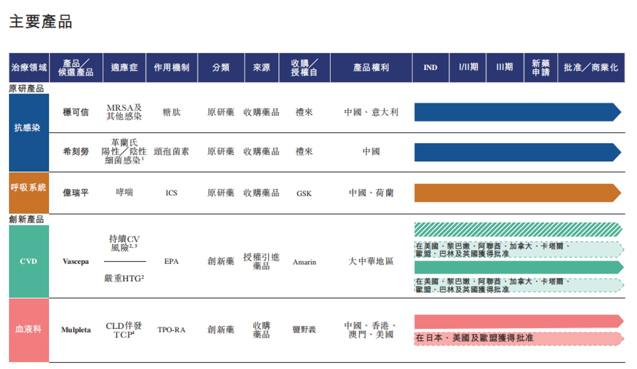 亿腾医药的产品组合包括五款主要产品,其中包括三款原研产品,即稳可信、希刻劳及亿瑞平,以及两款创新产品(即Vascepa及Mulpleta),这些主要产品已全部实现商业化。每款产品均针对大型或快速增长的治疗领域的医疗需求,包括抗感染、CVD及呼吸系统疾病。