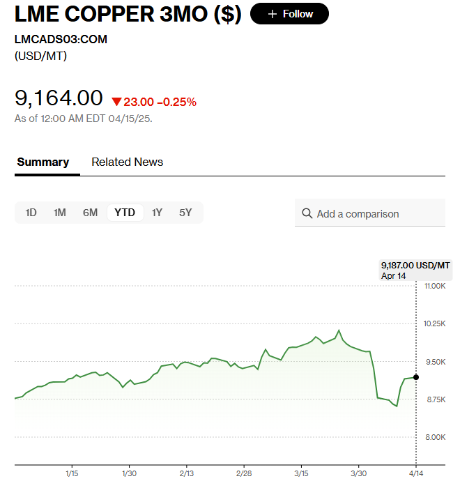 在伦敦,LME铜价当前徘徊于9160美元/吨附近,在3月份的全球“抢铜潮”推动之下一度飙升至略超过10000美元里程碑关口的全年最高点,此后随着“抢铜潮”因铜金属被排除在特朗普对等关税清单之外而大幅回调。在纽约,计划于4月交割的COMEX铜期货周二收平于4.611美元/磅,此前五日连涨累计涨幅达11.7%。