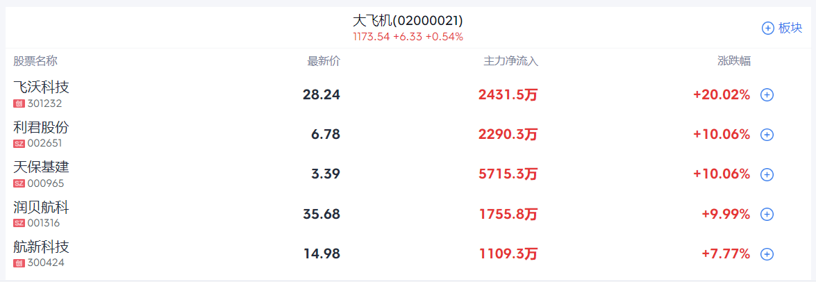 大飞机概念股逆势活跃,利君股份、润贝航科双双涨停,通易航天、飞沃科技、炼石航空、三角防务、航发科技、爱乐达、通达股份等跟涨。