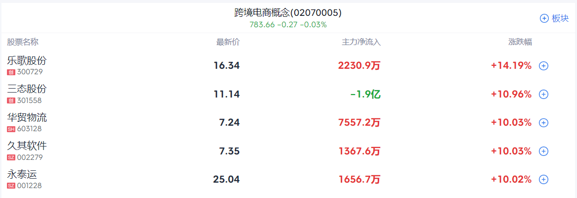 跨境电商概念延续强势,华贸物流、浔兴股份、永泰运、久其软件等多股涨停,新华锦、苏豪弘业、瑞贝卡、三态股份等纷纷冲高。