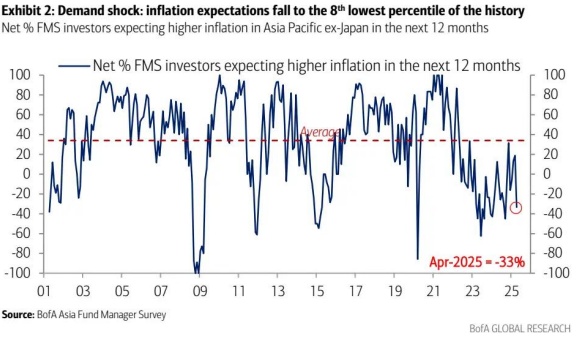 亚洲(除日本外)未来12个月通胀预期净33%的受访者看升,为历史最低水平。