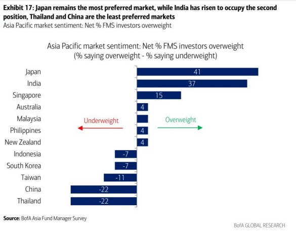 国家配置方面,日本继续保持最受青睐地位,印度在过去六个月跌出“雷达”后重返第二。