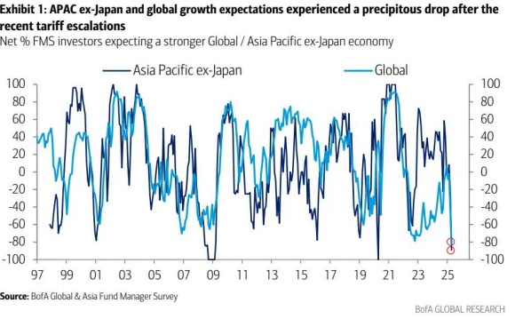关税升级后,亚洲(除日本外)净89%、全球净82%的受访者预期经济走弱,创多年低点。