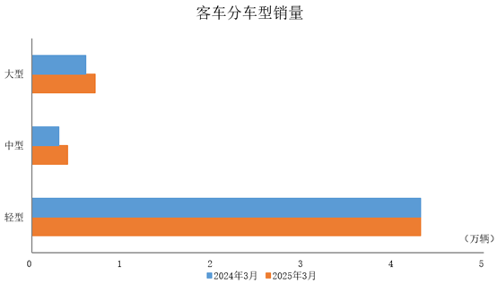 2025年3月,客车产销分别完成5万辆和5.3万辆,环比分别增长37.9%和55.2%,产量同比增长1.4%,销量同比下降0.1%。在客车细分品种中,与上月相比,三大类客车品种产销均呈现快速增长;与上年同期相比,轻型客车产销微降,其他两大类客车品种产销呈不同程度增长。