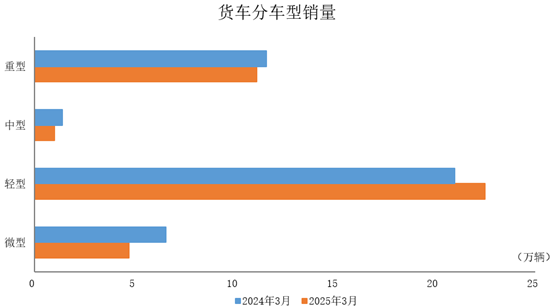 2025年3月,货车产销分别完成38.1万辆和39.4万辆,环比分别增长35.6%和41.3%,同比分别下降1.7%和2.7%。在货车细分品种中,与上月相比,微型货车产量微降、销量快速增长,其他三大类货车品种产销均呈快速增长;与上年同期相比,轻型货车产销实现增长,其他三大类货车品种产销呈不同程度下降。