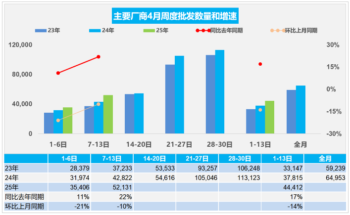 乘用车:4月1-13日,全国乘用车市场零售51.5万辆,同比去年4月同期增长8%,较上月同期下降14%,今年以来累计零售564.2万辆,同比增长6%;4月1-13日,全国乘用车厂商批发57.7万辆,同比去年4月同期增长17%,较上月同期下降14%,今年以来累计批发685.5万辆,同比增长12%。