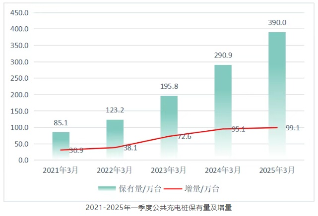 统计数据表明,在公共充电桩保有量方面,2021年3月为85.1万台;2022年3月增长至123.2万台,较上一年增长约45.1%;2023年3月保有量达到195.8万台,较上一年增长约59.0%;2024年3月保有量为290.9万台,较上一年增长约48.6%;2025年3月保有量攀升至390.0万台,较上一年增长约34.1%。从2021年至2025年,公共充电桩保有量持续增长,增长速度于2023年达到峰值。