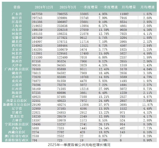 广东省以700255台的保有量位居榜首,江苏省、浙江省和上海市紧随其后,经济发达地区的充电桩建设处于领先地位。新疆维吾尔自治区在2025年一季度增量达11084台,增速高达37.97%,表现格外突出。内蒙古自治区(7972台,增速24.49%)、青海省(4821台,增速24.54%)和广西壮族自治区(9511台,增速12.45%)也展现出较高的增量增速。
