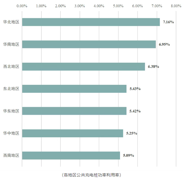 整体而言,全国公共充电桩利用率普遍偏低(均低于7%),但区域差异显著,华南、华北、西北相对较高,华东、华中、西南较低。