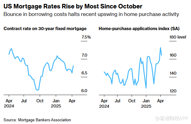 智通财经APP获悉,受美国国债市场波动加剧影响,美国抵押贷款利率上周出现了自去年10月以来的最大涨幅,导致购房和再融资申请减少。根据美国抵押贷款银行家协会(MBA)周三公布的数据,截至4月11日当周,30年期抵押贷款合约利率上升20个基点,至6.81%,为2月份以来的最高水平。可调整利率和15年期固定抵押贷款利率也攀升。