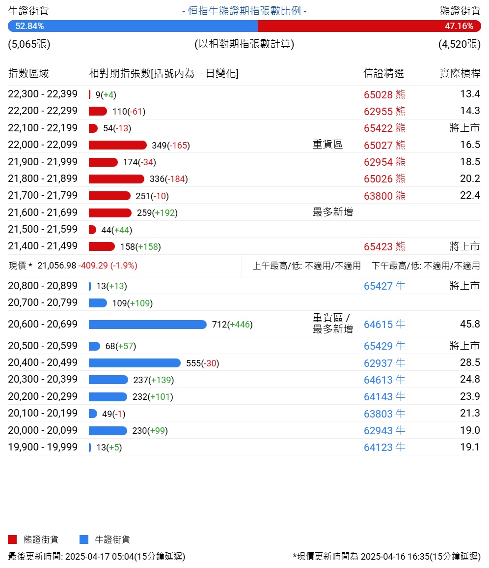 智通财经APP获悉,截至4月17日,恒指最新的牛熊街货比例为53:47。