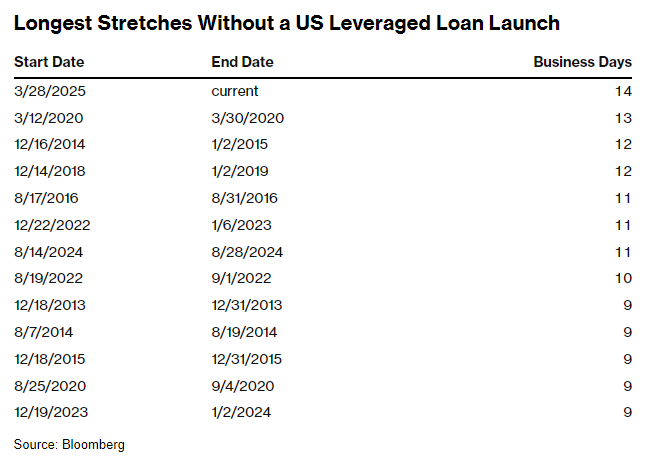 智通财经APP获悉,美国杠杆贷款市场正面临自2013年以来最漫长的交易空窗期。根据回溯至逾十年前的汇编数据显示,如果在今天结束前没有新的交易公布,那么周三将是连续第14个没有发行的交易日——此前的纪录是2020年3月新冠疫情在美国爆发初期创下的13天交易停滞。