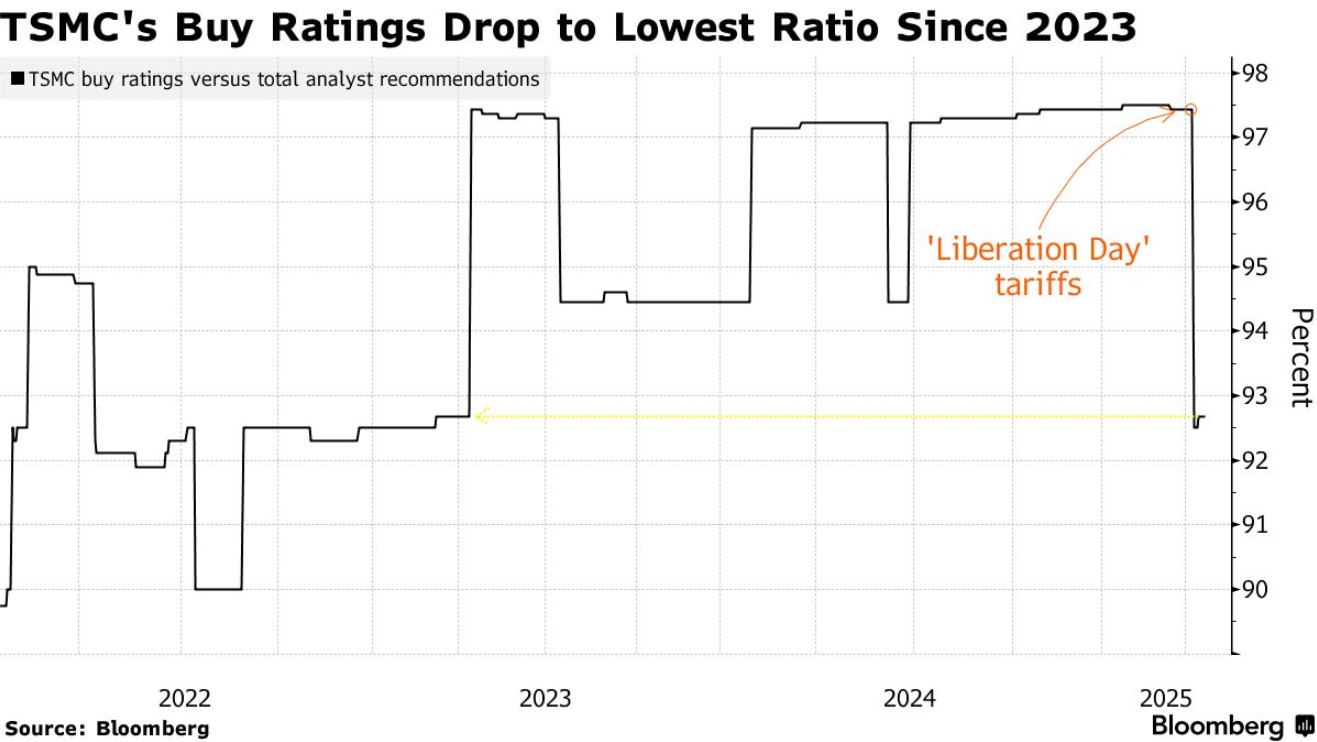 智通财经APP获悉,美国关税阴云正笼罩全球半导体产业。随着特朗普政府芯片出口管制升级,台积电(TSM.US)季度财报发布前的市场乐观情绪显著降温。数据显示,目前跟踪台积电的机构中,近93%仍维持"买入"评级,这一比例接近两年来的最低水平。在特朗普总统的关税政策震撼全球市场之前,这一比例曾接近98%。