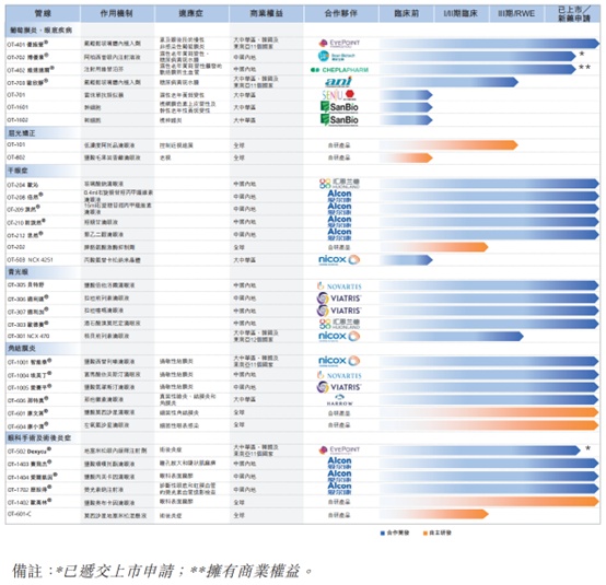 截止目前,欧康维视生物已拥有34种涵盖所有主要的眼前及眼后段的药物资源,其中有21款产品正处于商业化销售阶段,3款产品正处于III期临床试验,2款产品已进入商业化注册阶段,为目前中国眼科药物处于III期临床及上市注册阶段数量最多的创新药企之一。
