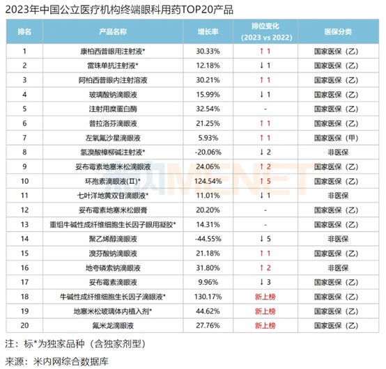 目前,欧康维视生物的产品管线已覆盖葡萄膜炎、眼底疾病、屈光矫正、干眼症、青光眼、角结膜炎、眼科手术及术后炎症等领域,其中最受关注的无疑是OT-702(博优景®,阿柏西普眼内注射溶液)。数据显示,在2023年眼科用药TOP20排名中,阿柏西普眼内注射溶液位于前三,全年销售额超过10亿元。