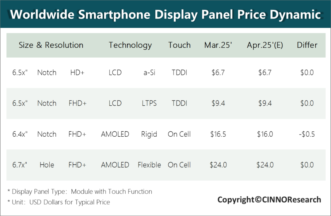 CINNO Research预测,2025年4月和5月a-Si面板品牌端价格趋势尚待观察;LTPS面板价格短期保持稳定;刚性AMOLED面板价格预计下降0.5美金;柔性AMOLED面板价格短期内仍保持稳定。