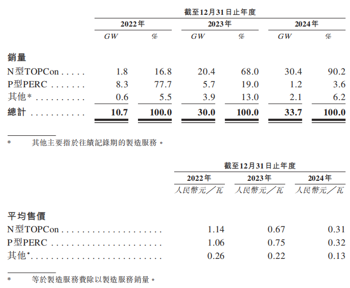 值得一提的是,2024年钧达股份主要产品的市场销售情况表现不一,其中N型TOPCon电池销量为30.4GW,较上年的20.4GW显著增长,但平均售价则从23年的0.67元/瓦降至0.31元/瓦。同期,P型PERC电池销量为1.2GW,平均售价0.32元/瓦,呈现量价齐跌的态势。