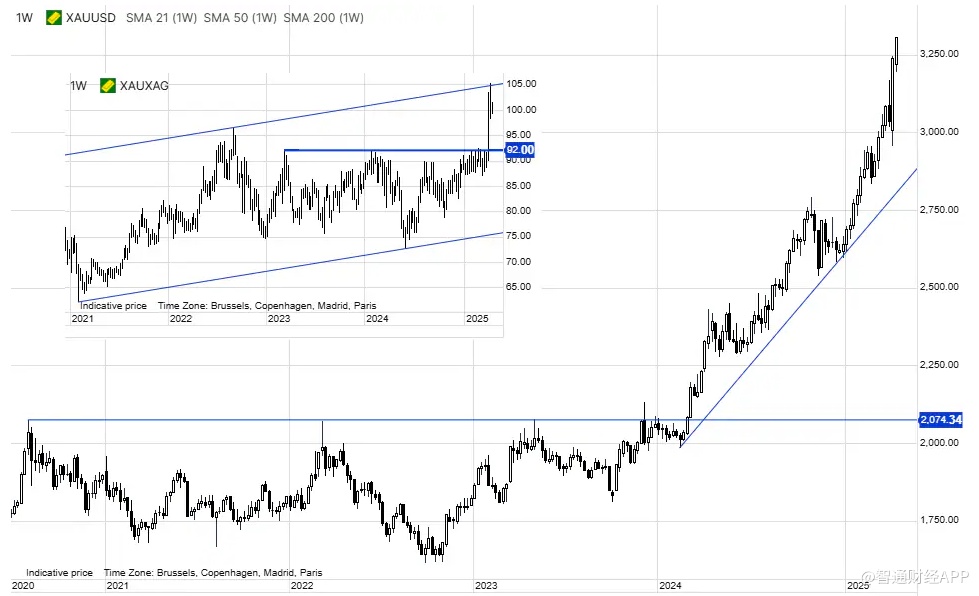 尽管金价已突破3300美元大关,再创历史新高,但白银尚未触及2024年10月创下的34.90美元的高点,尤其是在4月3日美国总统特朗普发起关税攻势后的几天内,这种半工业金属暴跌18% 。然而,盛宝银行发现,在过去三年里,即使在各大央行创纪录的购买量支撑黄金的时期,金银比率平均在85左右。