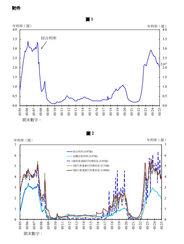 智通财经APP获悉,4月17日,香港金管局公布2025年3月底的综合利率。反映银行平均资金成本的综合利率在2025年3月底为2.07厘,较2025年2月底的2.09厘下跌2基点。综合利率下跌,主要反映月内存款的加权资金成本减少。