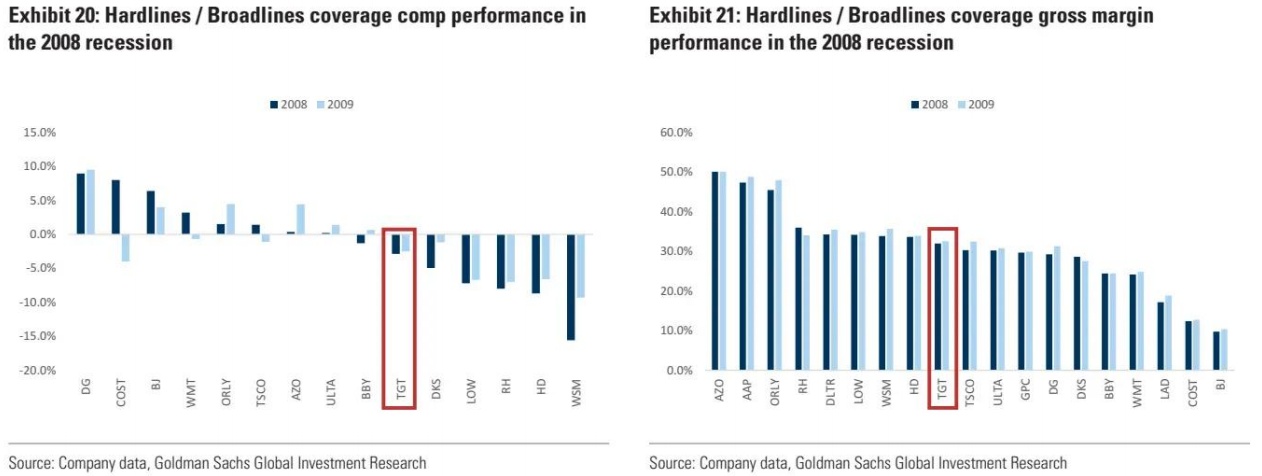 这说明在经济衰退期间,塔吉特因其在非必需品领域的敞口而面临挑战。具体来说,在2008年经济衰退期间,塔吉特通过他们的促销环境和营销计划来强调价值,以与有竞争力的价格竞争。然而,由于这些较大的降价和客户流量的下降,如家居和服装等非必需领域,塔吉特的毛利率下降。高盛还注意到,随着经济衰退的复苏,塔吉特的非必需品类别表现强劲,消费者信心增强,库存管理有所改善。
