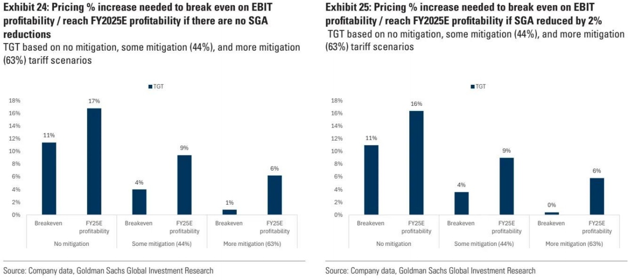 高盛认为,考虑到潜在的营收去杠杆化和关税风险,每股收益的下行风险大于上行风险。4月11日,特朗普将电子产品(CBP指南中列出的20种产品类别,如智能手机、电脑、笔记本电脑等)从对等关税中豁免。这一豁免适用于特朗普总统最近对中国征收的125%的对等关税,但20%的关税仍然有效。鉴于这一豁免,根据三种关税缓和方案以及三种SG&A估算案例,并假设塔吉特的剩余关税税率为95%;高盛发现,如果SG&A成本保持不变,塔吉特需要将其价格提高1%-11%(取决于关税缓解率)才能在EBlT盈利能力上实现收支平衡。