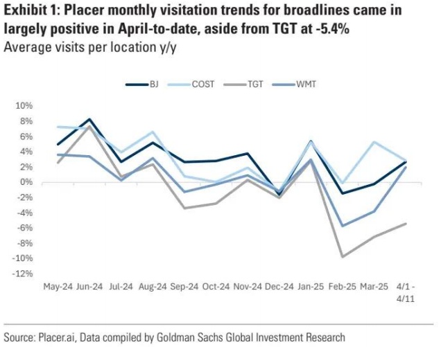 高盛指出,短期内,不太可能看到可自由支配品类的增长复苏。鉴于关税和通胀前景的不确定性似乎对消费者信心和预期造成了影响,高盛认为,非必需品类的复苏相较于其预期将被推迟。塔吉特在24财年的产品组合中约有53%是由可自由支配类别构成的,这可能会导致该公司受到消费者支出下降的更严重影响,比其他同行更容易受冲击(如BJ批发俱乐部(BJ.US),开市客(COST.US)或沃尔玛(WMT.US),更多的是食品杂货)。