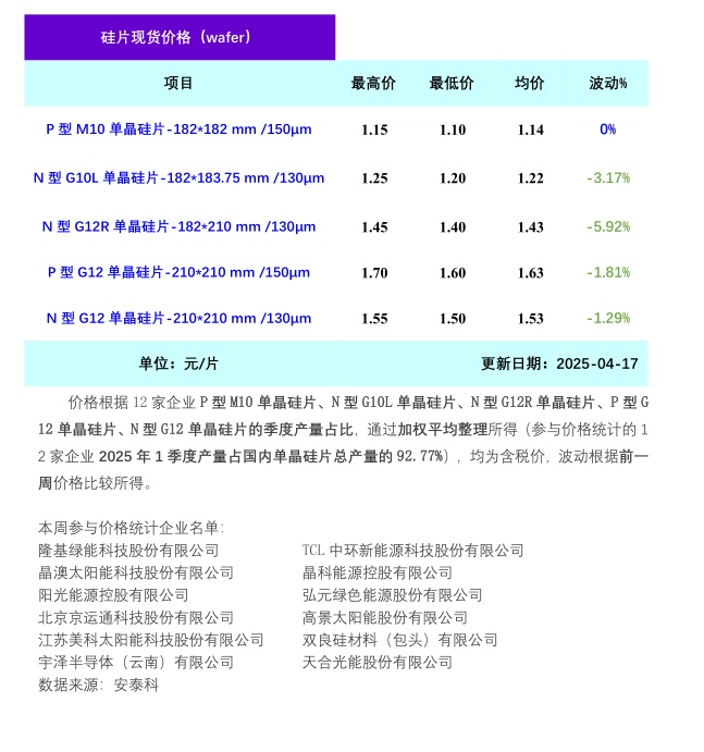 智通财经APP获悉,4月17日,硅业分会发文称,本周硅片价格大幅下跌,其中N型G10L单晶硅片(182*183.75mm/130μm/256mm)成交均价在1.22元/片,周环比跌幅3.17%;N型G12R单晶硅片(182*210mm/130μm)成交均价在1.43元/片,周环比跌幅5.92%;P型G12单晶硅片(210*210mm/150um)成交均价在1.63元/片,周环比跌幅1.81%;N型G12单晶硅片(210*210