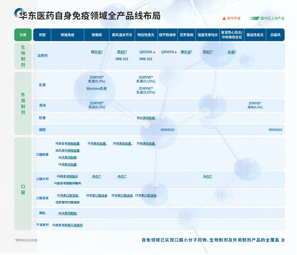 在自免和外用制剂领域,截至目前,华东医药在自免领域已拥有在研生物药和小分子创新产品20余款,公司在研和进入商业化的外用制剂产品已达10项。与美国Arcutis合作的罗氟司特乳膏用于治疗6岁及以上患者的特应性皮炎、斑块状银屑病2个适应症的中国IND申请已于2024年9月获得批准,并均于 2024年 11月在中国完成Ⅲ期临床首例受试者入组。目前,华东医药在银屑病治疗领域已形成单抗、口服及外用制剂的“黄金产品组合”,将为国内成人及儿童银屑病患者带来更多用药选择,实现全周期全人群覆盖。