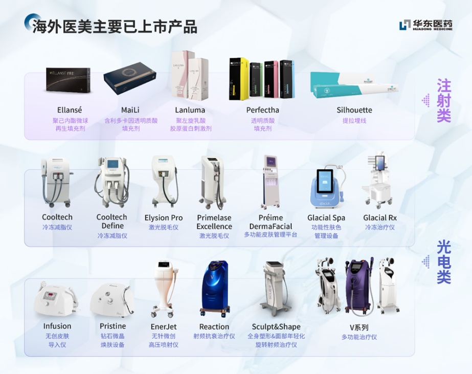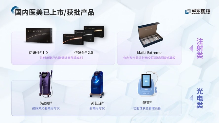 华东医药拥有国际化的医美运营和BD团队,已实现非手术类医美注射产品和能量源器械中高端市场全覆盖:在注射类产品实现再生类、玻尿酸、肉毒素三大品类的全覆盖;在面部和身体填充、面部清洁、身体塑形、埋线、能量源器械等领域拥有多款专利产品的全球权益。