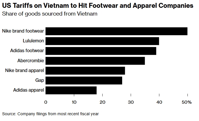 对主要国际品牌而言,关税将直接影响其成本结构。耐克(NKE.US)2024年有约50%的鞋类产品和28%的服装来自越南;阿迪达斯(ADDYY.US)38%的鞋子产自越南,23%的服装来自柬埔寨;Lululemon(LULU.US)有40%的产品产自越南,17%来自柬埔寨,7%来自孟加拉;昂跑(ONON.US)更是有高达90%的鞋类来自越南。这些品牌在面对高额关税时,不得不考虑涨价或重新布局供应链。