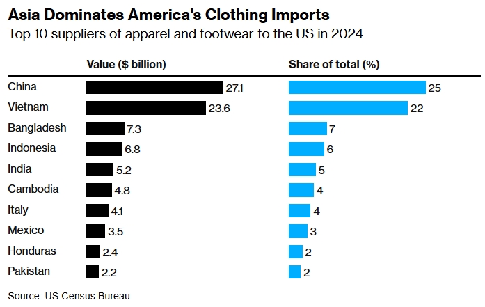 根据美国服装与鞋类协会的数据,美国97%的服装和鞋类依赖进口,几乎所有在美售出的新衣服和鞋子都将受到关税影响。2024年,美国从全球进口约1080亿美元服装,其中超过一半来自中国、越南和孟加拉。在十大供应国中,有七个来自亚洲。