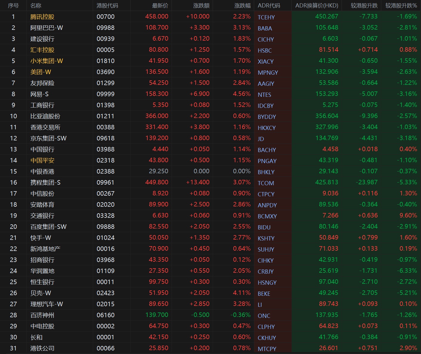 智通财经APP获悉,周四美股三大股指涨跌不一,恒生指数ADR下跌,按比例计算,收报21150.38点,较香港收市下跌244.76点或1.14%。