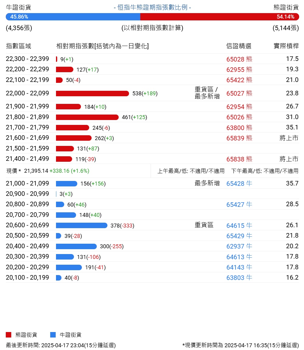 智通财经APP获悉,截至4月18日,恒指最新的牛熊街货比例为46:54。