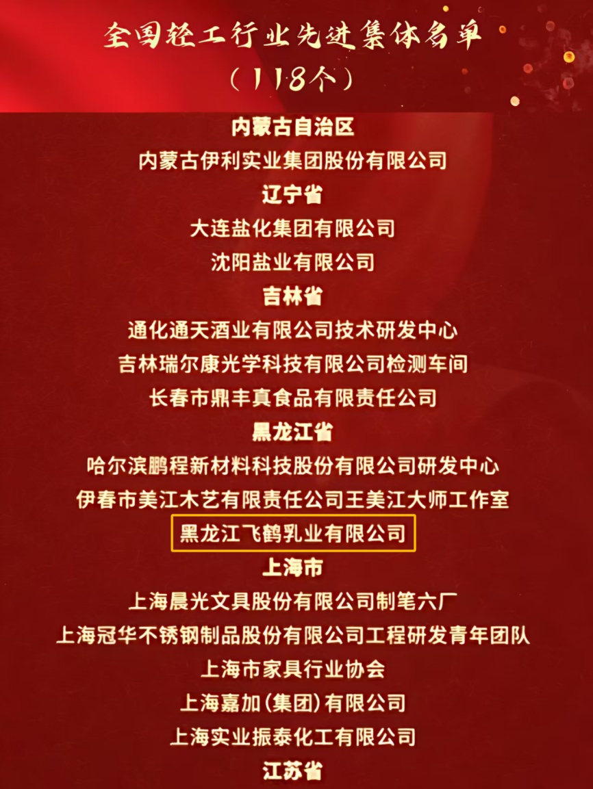 “全国轻工行业先进集体、劳动模范和先进工作者”评选,是轻工行业内极具权威性和影响力的荣誉。此次飞鹤入选全国轻工行业先进集体,标志着飞鹤为轻工业增品种、提品质、创品牌的进程作出积极贡献,其以国产婴配粉等高质量产品供给促进品质消费、优化产业结构的能力,为全国轻工行业起到先进典型的示范引领作用。