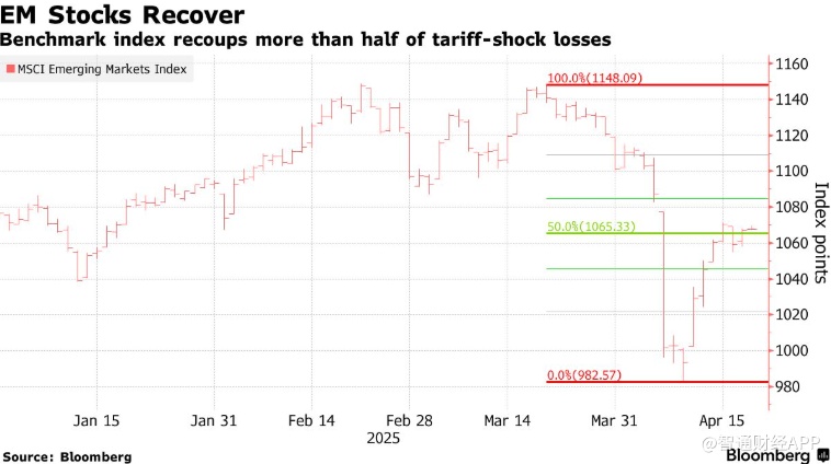 新兴市场周五的走势也受益于特朗普的言论,他表示不愿继续提高对华关税,因为这可能会阻碍两国贸易。MSCI新兴市场指数已收复3月底和4月初逾一半的失地,中国和印度股市是该指数上涨的主要动力。