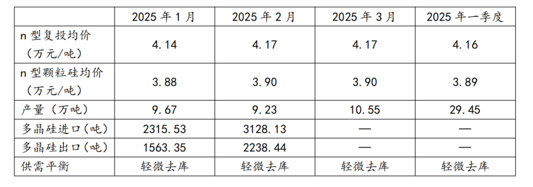 供需方面:展望2025年二季度,我国多晶硅市场供需仍维持平衡状态。虽然供应量不排除会受到部分新增产能投放及二季度末丰水期带来的影响,但考虑到目前价格低迷,多数企业将优先考虑采取产能置换的方式进行平衡,基本不会出现产量短期激增的情况,预期二季度国内供应量30-32万吨,增幅不超过10%。同时,二季度硅片产量有望达到150GW,对于硅料需求31.5万吨。虽然库存依旧保持高位,但是期货蓄水池作用逐步显现,也将缓解产业内的库存压力。
