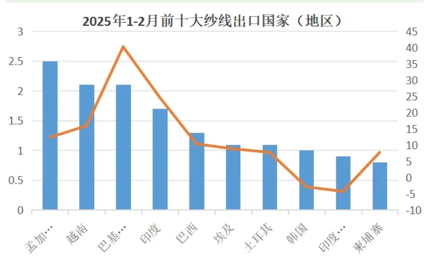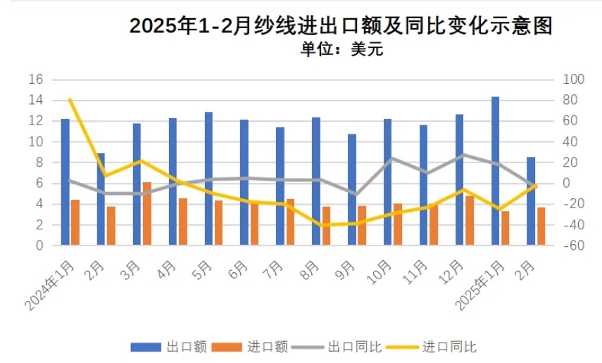 智通财经APP获悉,中国纺织品进出口商会发布2025年1-2月全国纱线进出口概况。1-2月,我国出口纱线104万吨,同比增长11.4%;单价2.20美元/公斤,同比下降2.5%。从具体产品看,2024年1-2月,棉纱线出口5.4万吨,增长32.4%;出口额2.1亿美元,增长19.9%。化纤纱线出口97.7万吨,增长10.5%;出口额19亿美元,增长7.7%。丝纱线出口527千克,增长21.9%;出口额为0.3美元,同比增长4.2%;羊毛动物毛纱线出口0.4万吨,增长12.5%;出口额为1.2亿美元,同比下降14.7%。