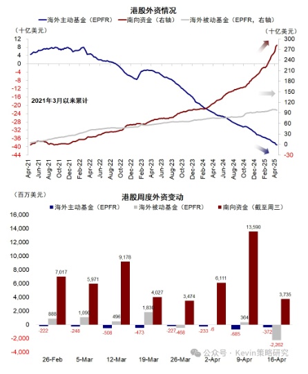 2)被动外资大幅流出,A股流出25.5亿美元(vs. 上周流出5.2亿美元),港股和ADR转为流出22.6亿美元(vs. 上周流入3.6亿美元),流出均以专注中国市场的基金。