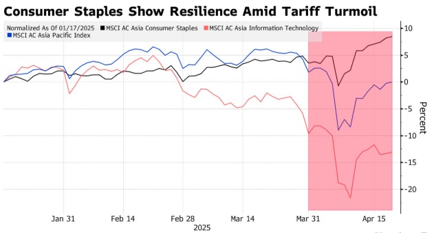在市场动荡期间,亚洲消费类股的表现也好于美欧同行,这得益于各国迅速承诺提供政策支持。在4月6日的一份报告中,高盛策略师将对亚洲消费必需品的评级从“与市场一致”上调至“增持”,称他们更倾向于“本地和防御”。上周四,摩根大通策略师对东南亚必需消费品行业采取了类似的评级上调。