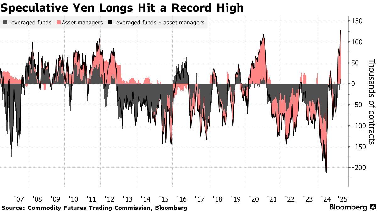 智通财经APP获悉,随着美国总统特朗普的贸易战引发对美国资产的抛售并提振了避险需求,投机交易员对日元的看涨押注创下有记录以来的最高水平。根据美国商品期货交易委员会(CFTC)截至4月15日的数据,资产管理者和杠杆基金对日元的净多头头寸上周攀升至历史新高。与此同时,对美元的空头头寸进一步上升。
