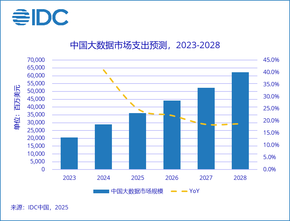 中国大数据市场承压上行,整体市场规模增速有所放缓。从短期发展来看,产业数字化转型浪潮与人工智能应用深化共同催生了企业对数据质量、数据时效性的更高标准,推动企业在数据治理体系建设和数据资产管理方面持续加码,为大数据市场注入发展动能。内需增速放缓和激烈竞争推动企业业务出海,促进了企业对大数据平台及解决方案的需求。长期来看,随着政府和企业预算逐步释放和市场规模渐成体系,中国市场大数据IT支出增速将逐步趋于平稳。